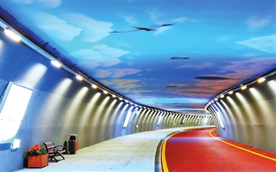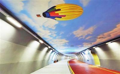 一路走下来,慢行隧道中的景致令人目不暇接,不管是隧道顶部绘制的蓝天白云、七彩飞鸟等图案,还是隧道两旁不断动态展示的户外宣传屏,都让人不自觉放慢脚步,步行千米丝毫不觉得审美疲劳。记者留意到,慢行隧道设置有多个紧急出口、安全出口等标志,让人安心。