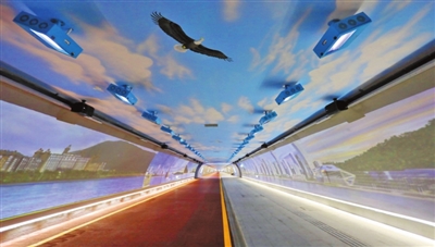 慢行隧道顶面以蓝天白云为底色,并加入飞鸟、热气球等元素图案,增添了人们通行其中的趣味性。更令人惊喜的是,在慢行隧道中段位置,有长约50米的视频动画投影段,在40个投影仪作用下,两大主题宣传片循环播放,展现珠海城市发展魅力。