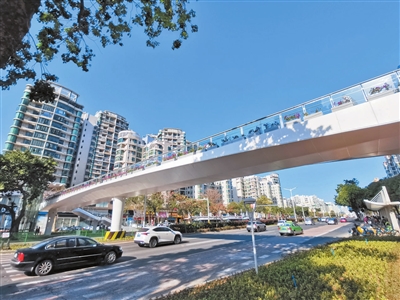 人民路贯穿香洲城区东西,是城市最重要的主干道之一。沿线住宅区、商业设施、学校众多。未来,随着香海大桥及其支线工程的全线通车,人民路的交通压力将有增无减。人民路快速化提升工程(人行天桥部分)正是在这一背景下开展建设。项目建设的三座天桥选址行人过街需求最大的三个节点——安居园公交站、红山公交站、工商大厦旁。昨日开放通行的安居园公交站天桥长60.45米,桥面铺装采用拉丝防滑花岗岩面砖,防滑性能佳。记者现场看到,配置的升降电梯符合无障碍出行需求。天桥两侧鲜花点缀,视野通透。